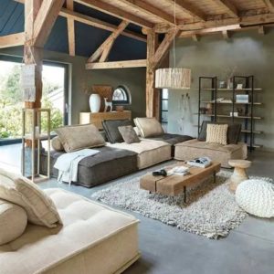 Matières naturelles : bois, osier, rotin, pierre brute, mais aussi tissage végétal, feuilles séchées, herbes de la pampa.